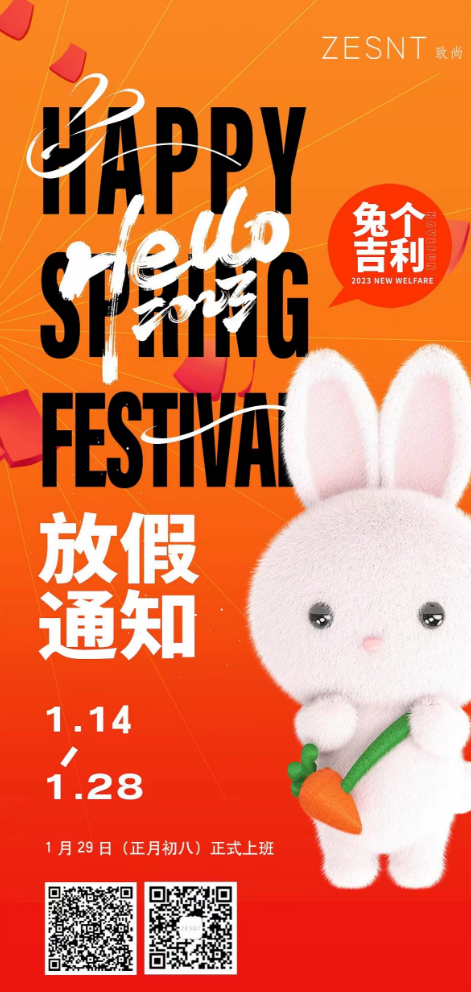 我司春節(jié)放假時(shí)間為(1月14日-1月28日),1月29日(正月初八)正式上班,感謝新老客戶,同事,供應(yīng)商2022年的大力支持。祝大家2023兔飛猛進(jìn) 前兔無量。